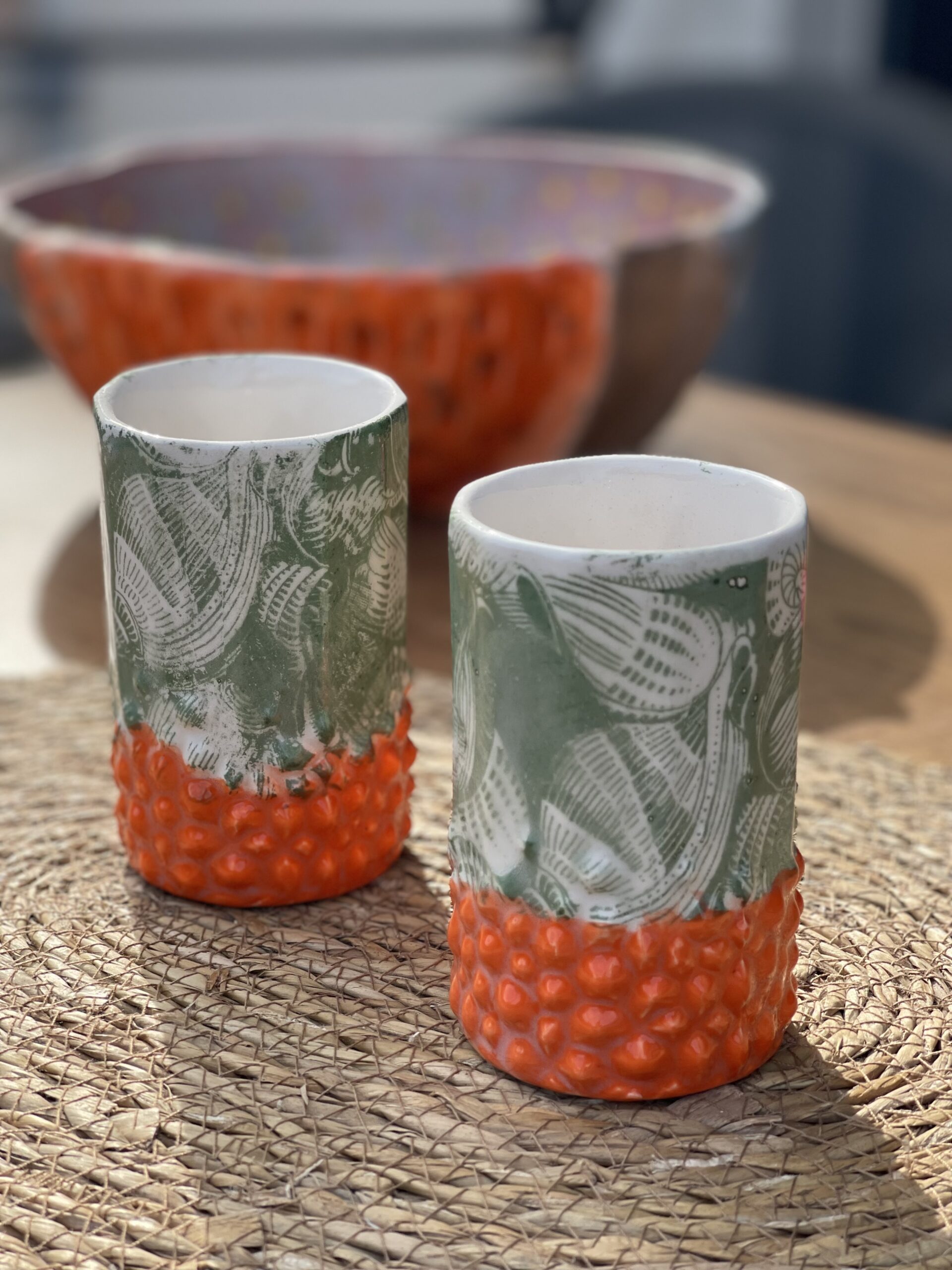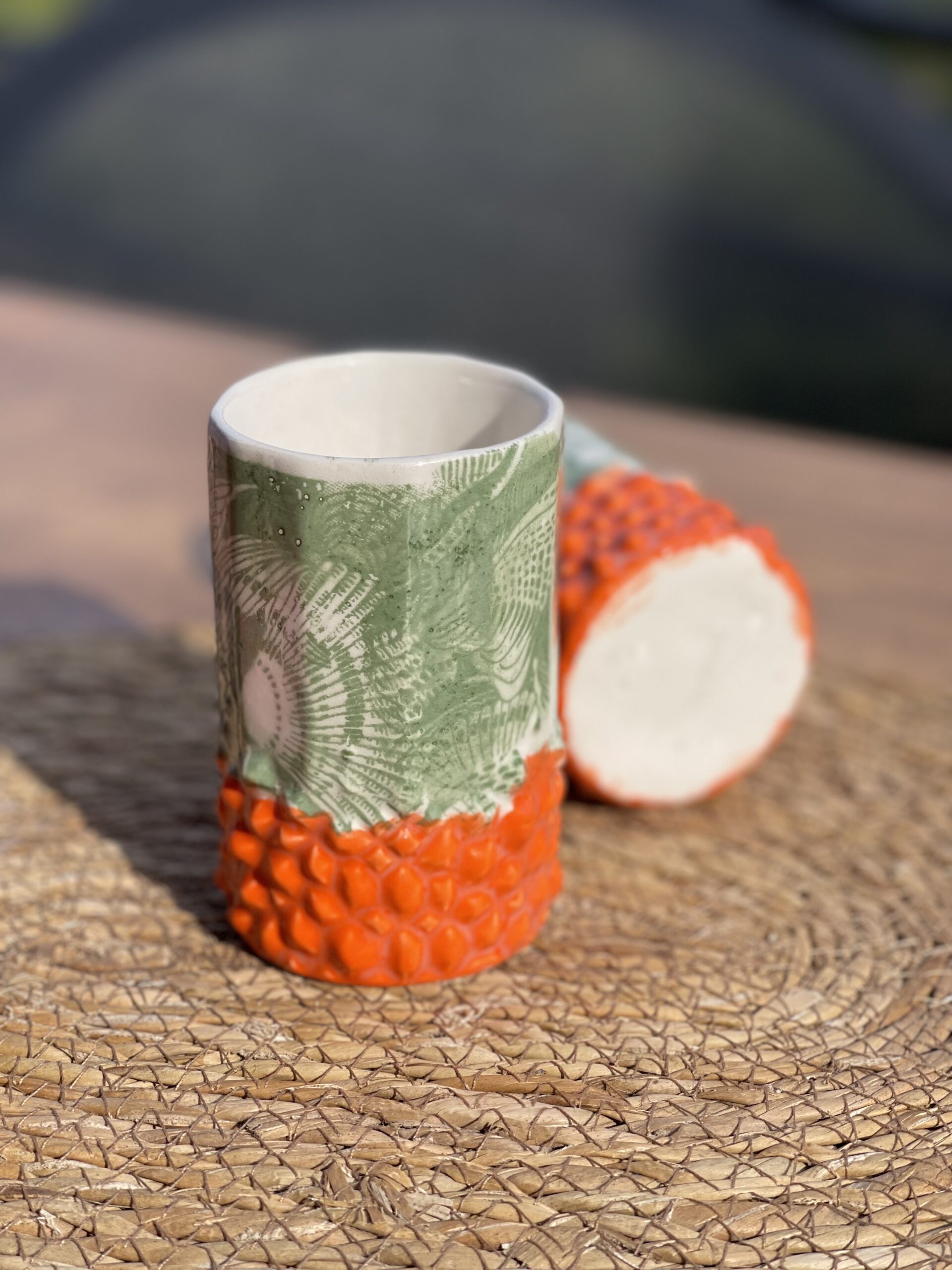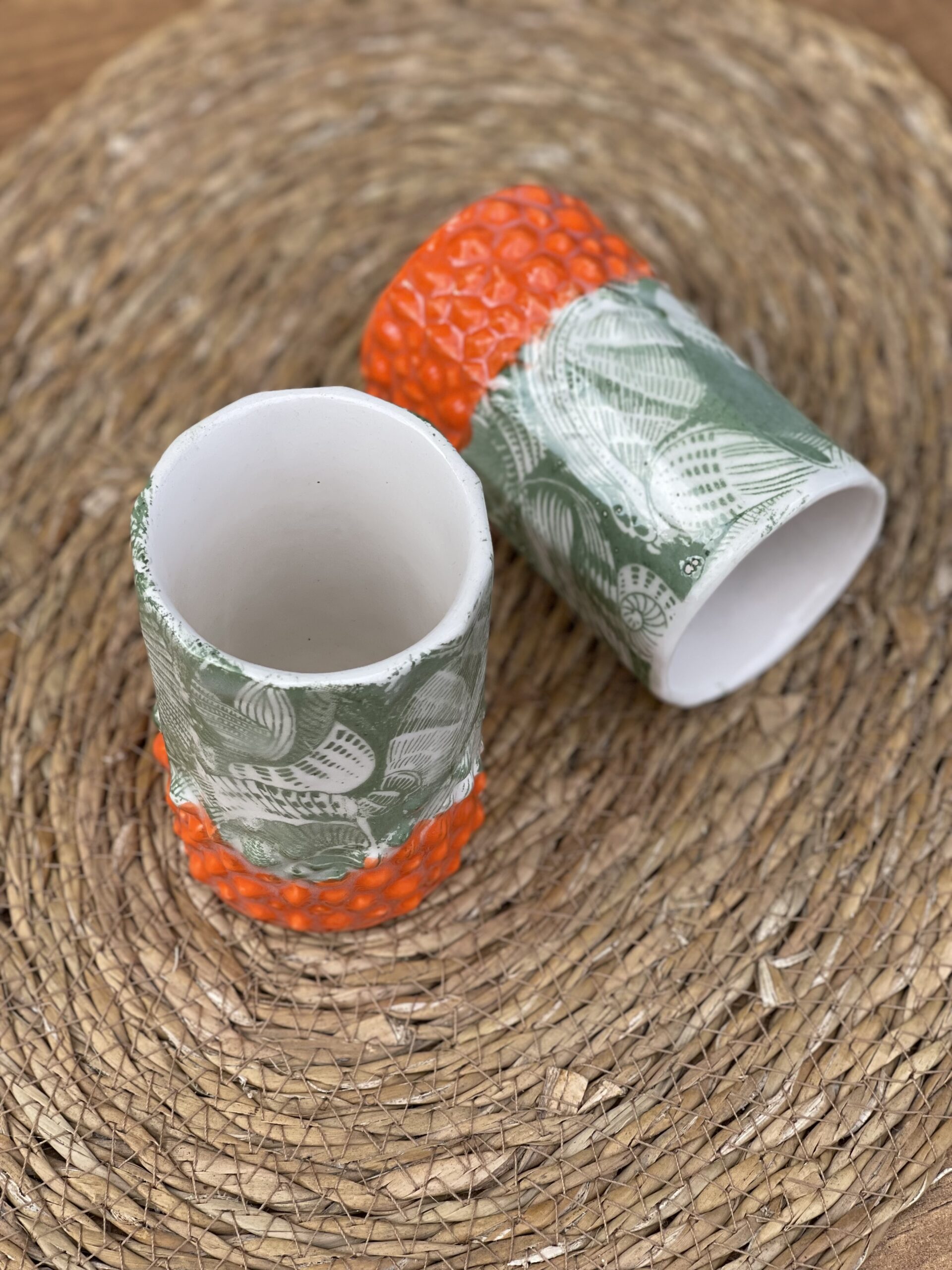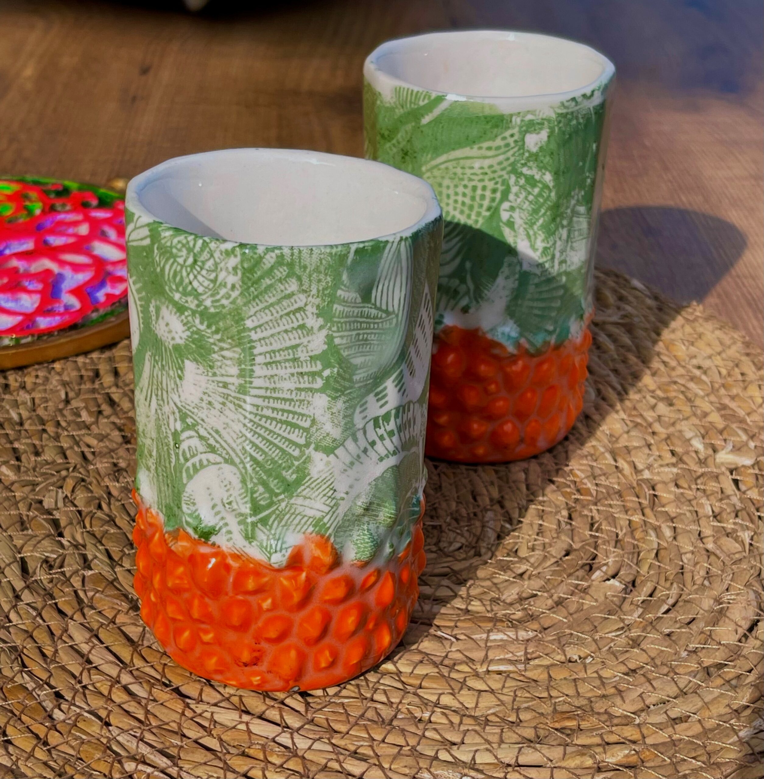 – Motif : reliefs pointus colorés en orange vifs ; fleurs en relief vert mat