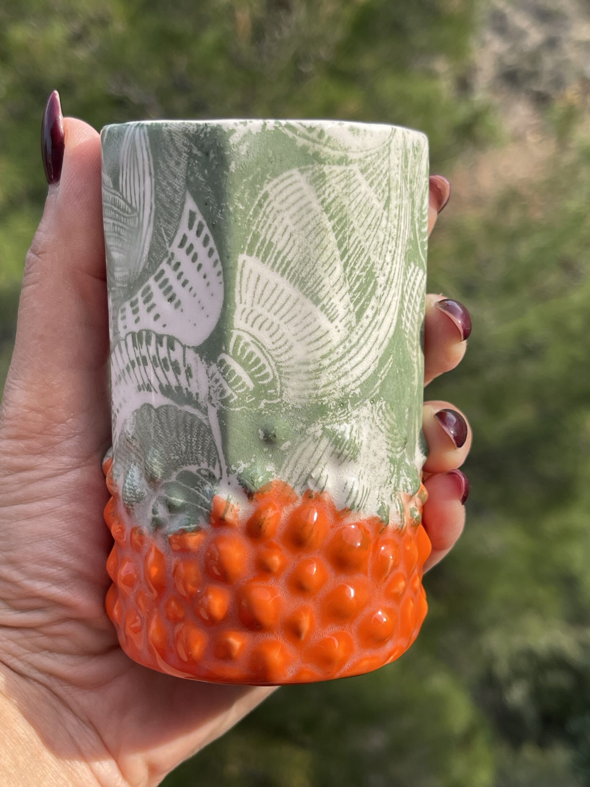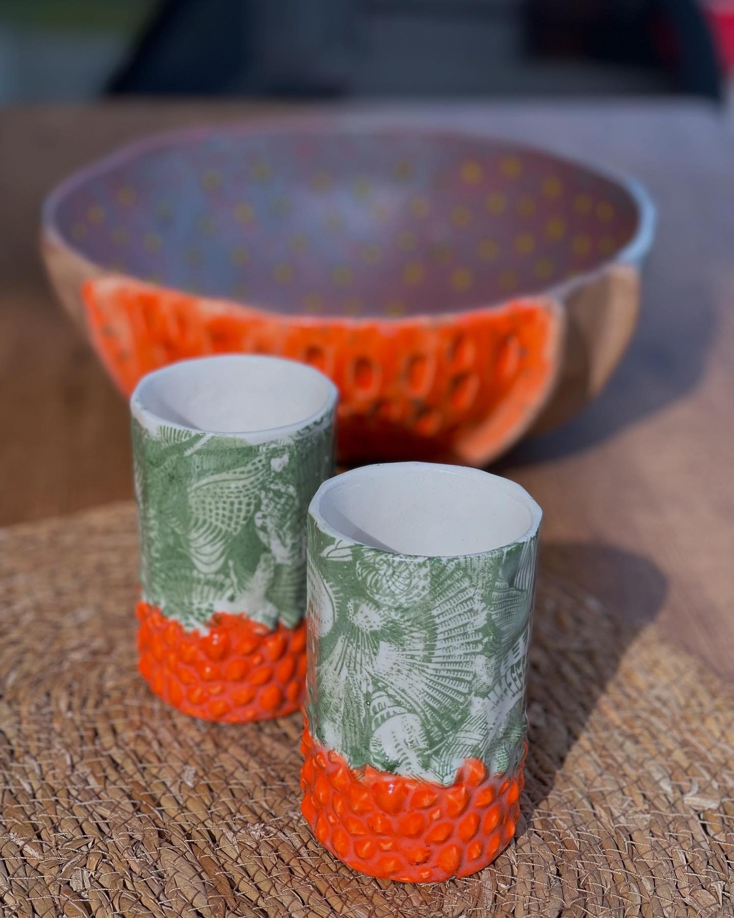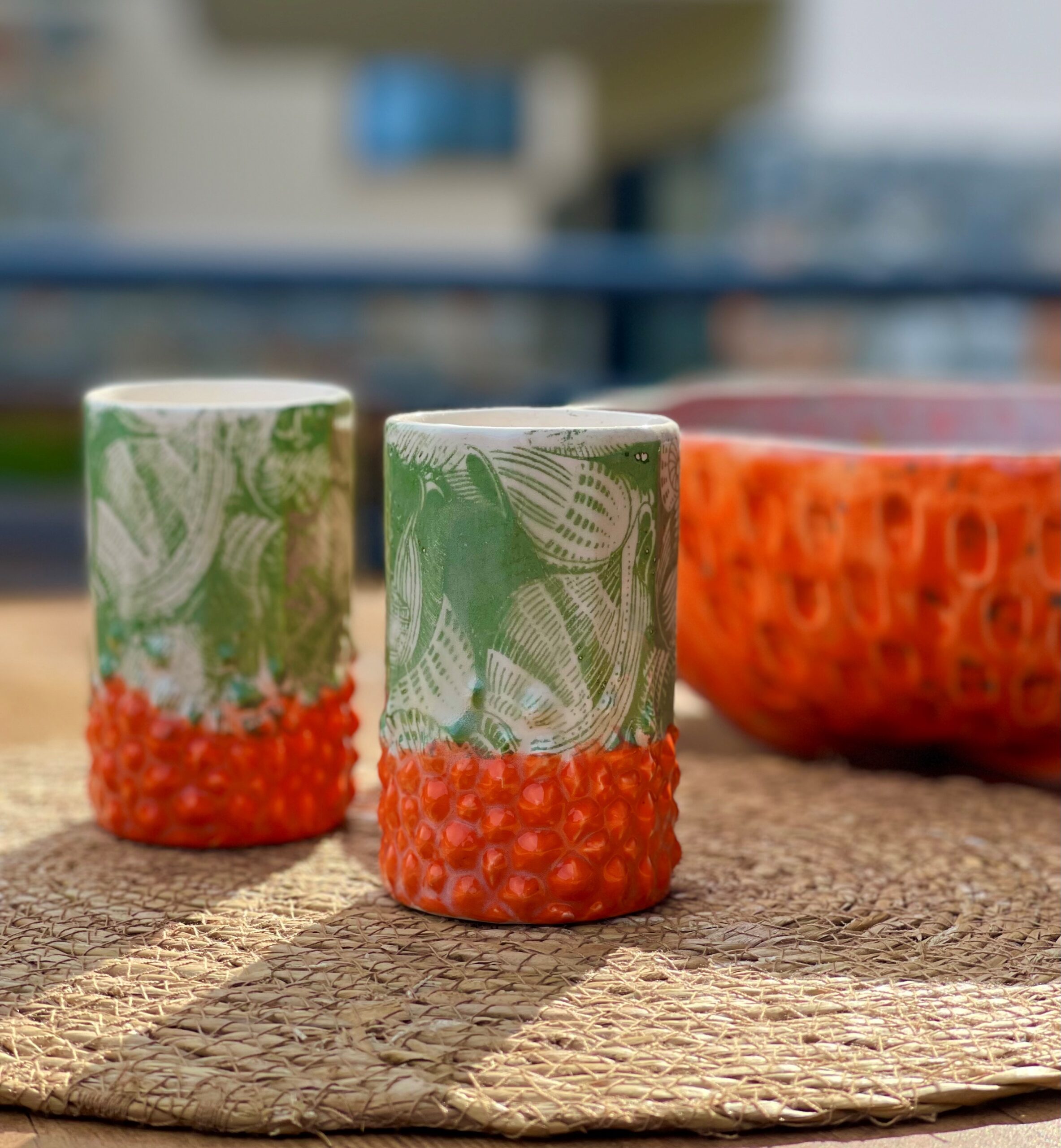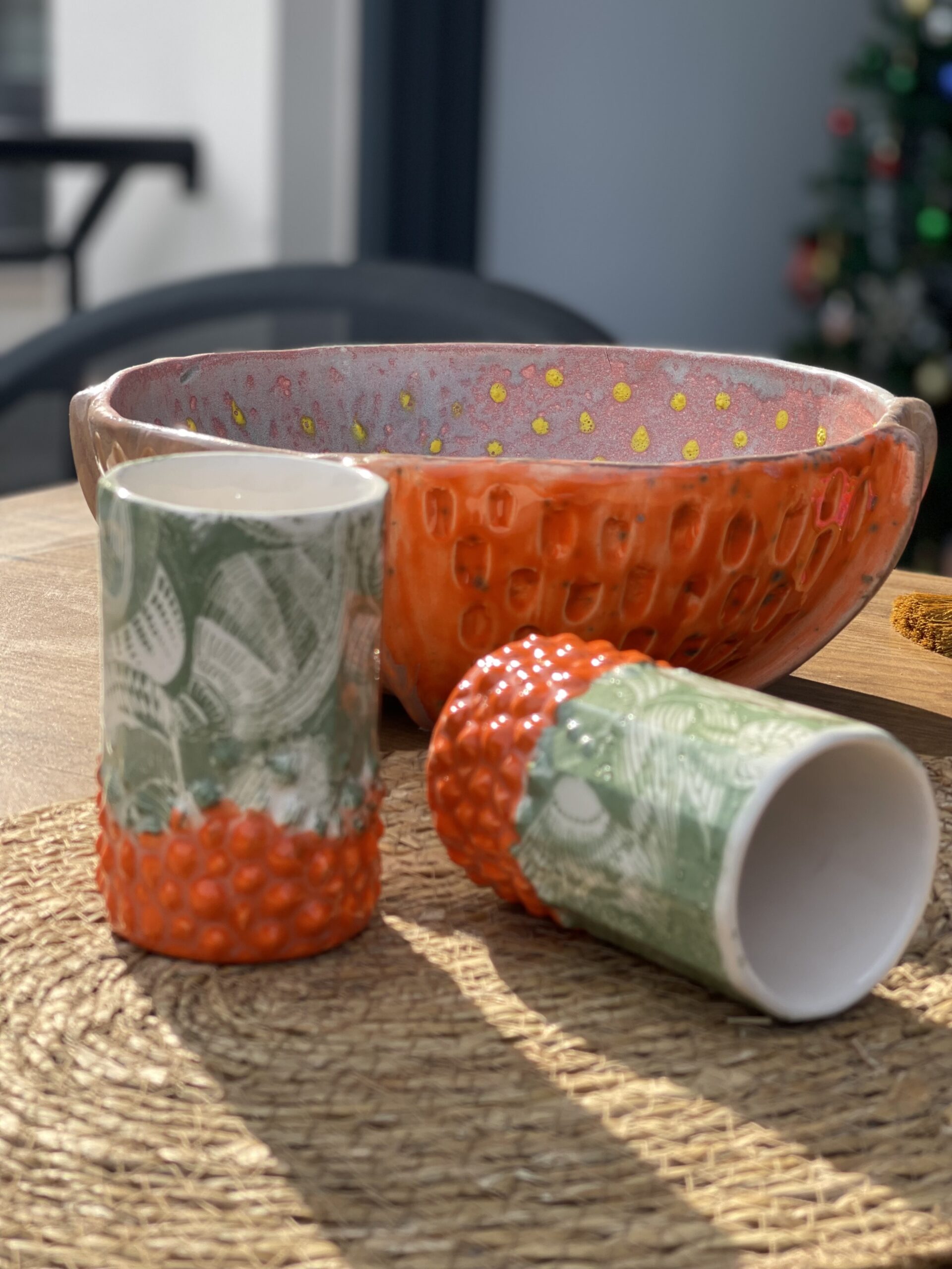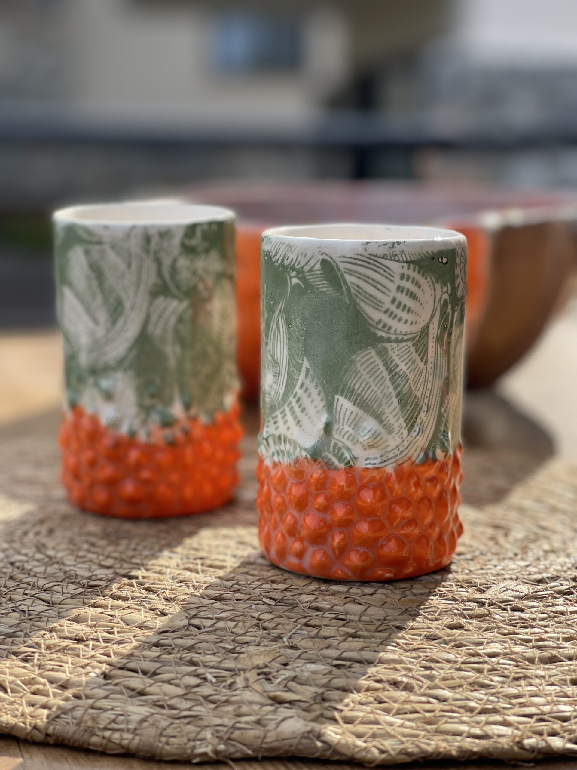 – Motif : reliefs pointus colorés en orange vifs ; fleurs en relief vert mat