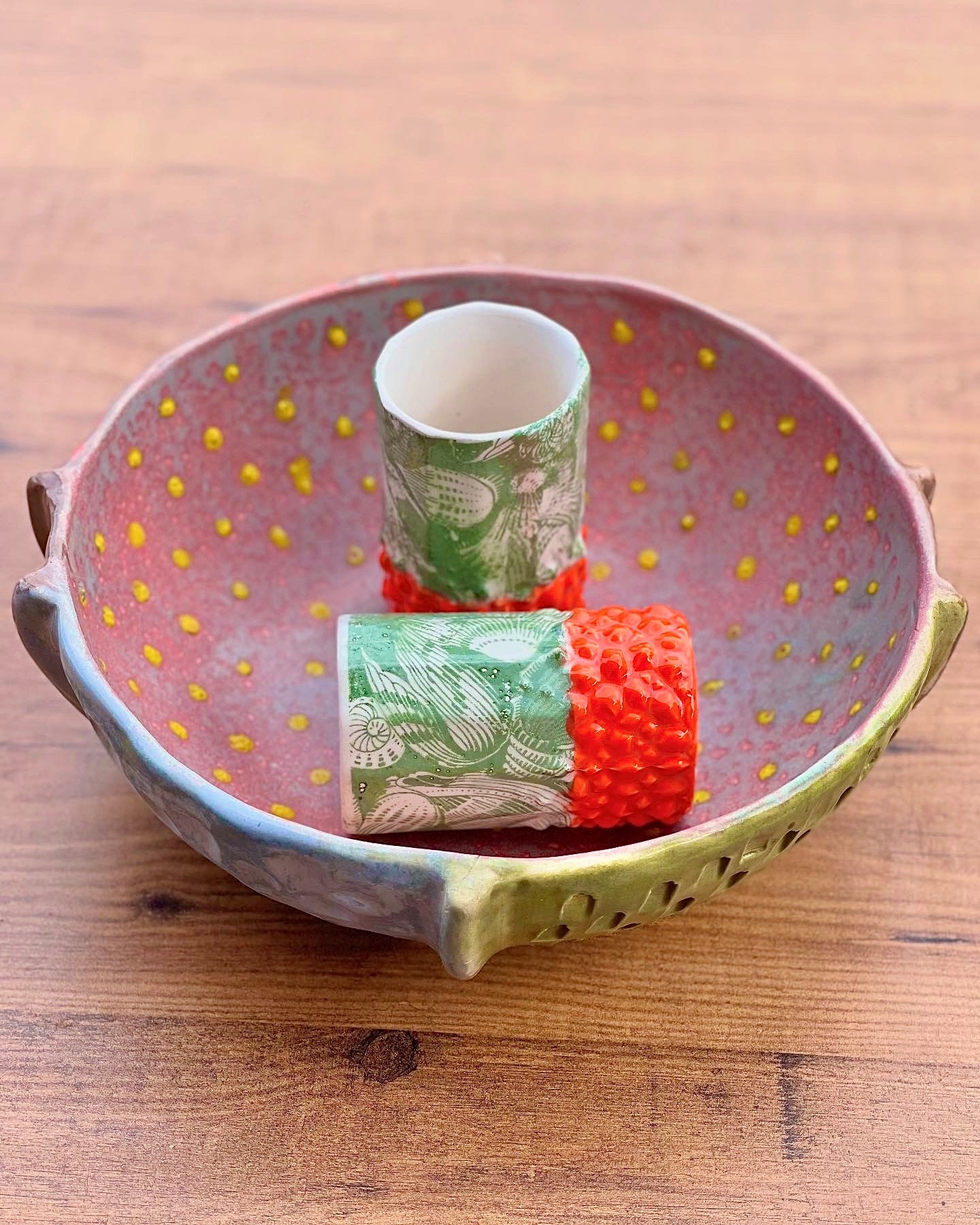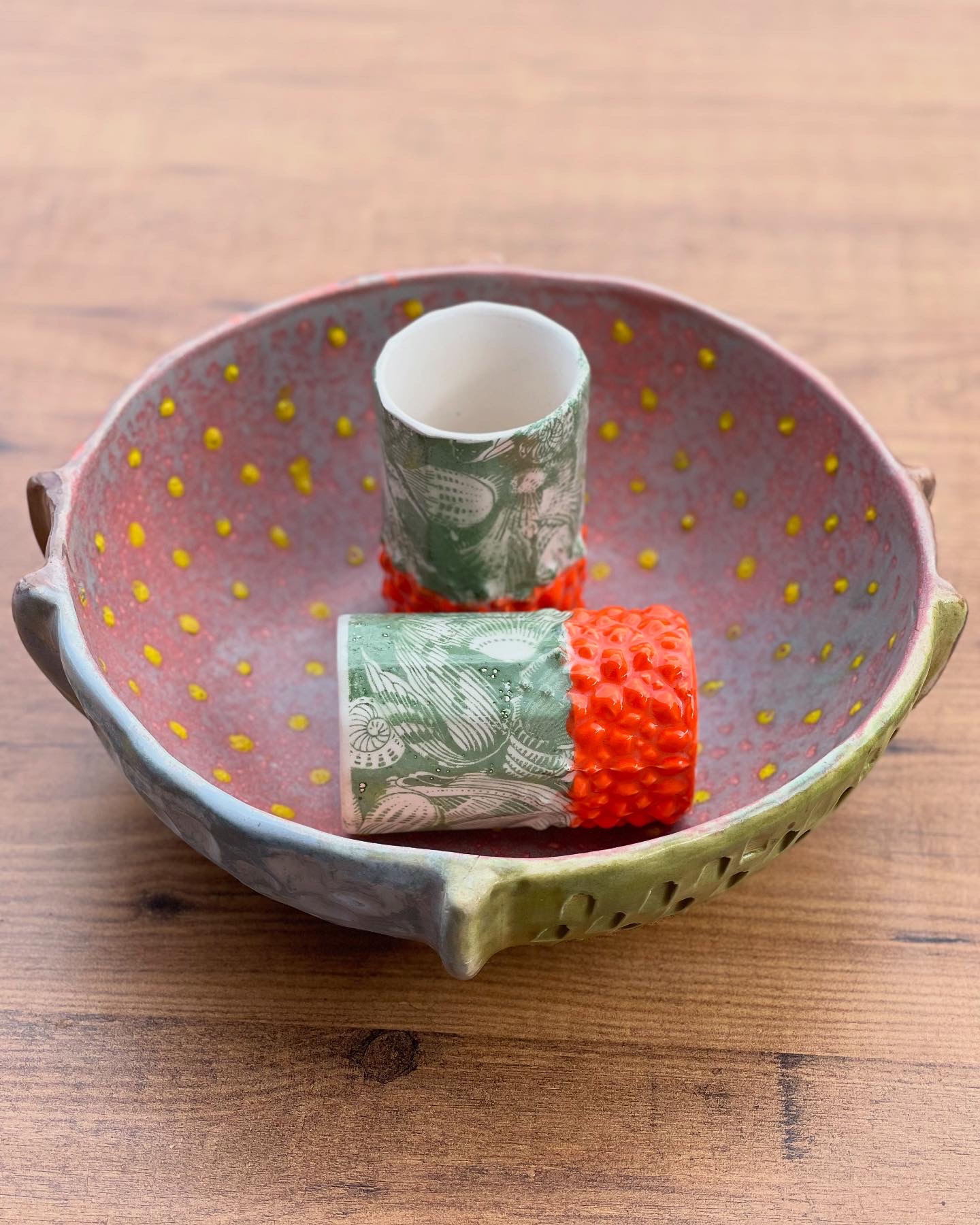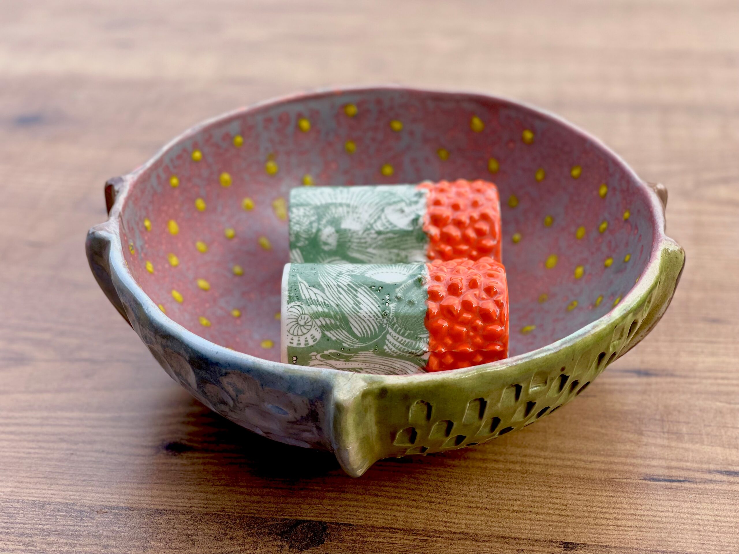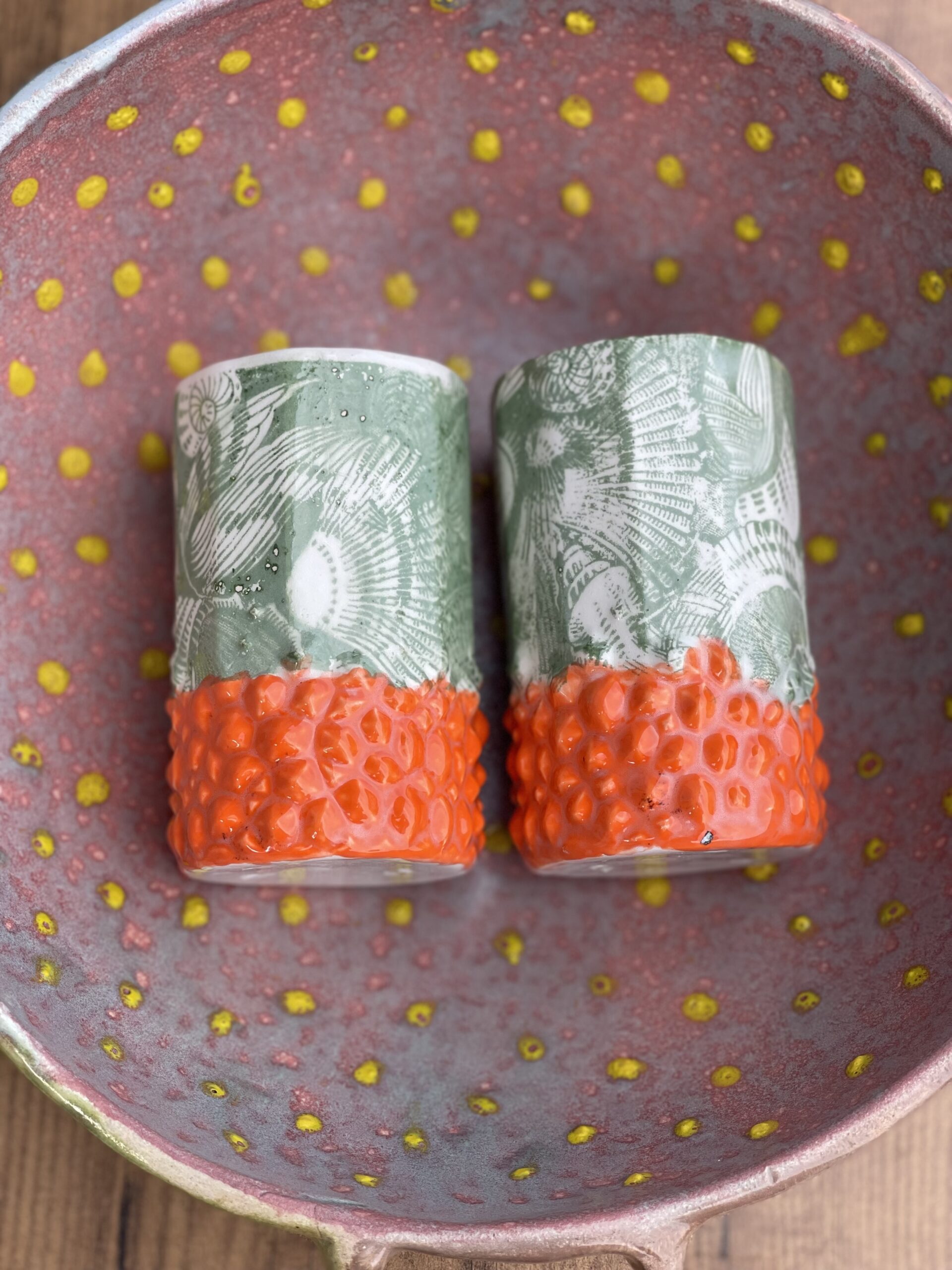 – Motif : reliefs pointus colorés en orange vifs ; fleurs en relief vert mat
